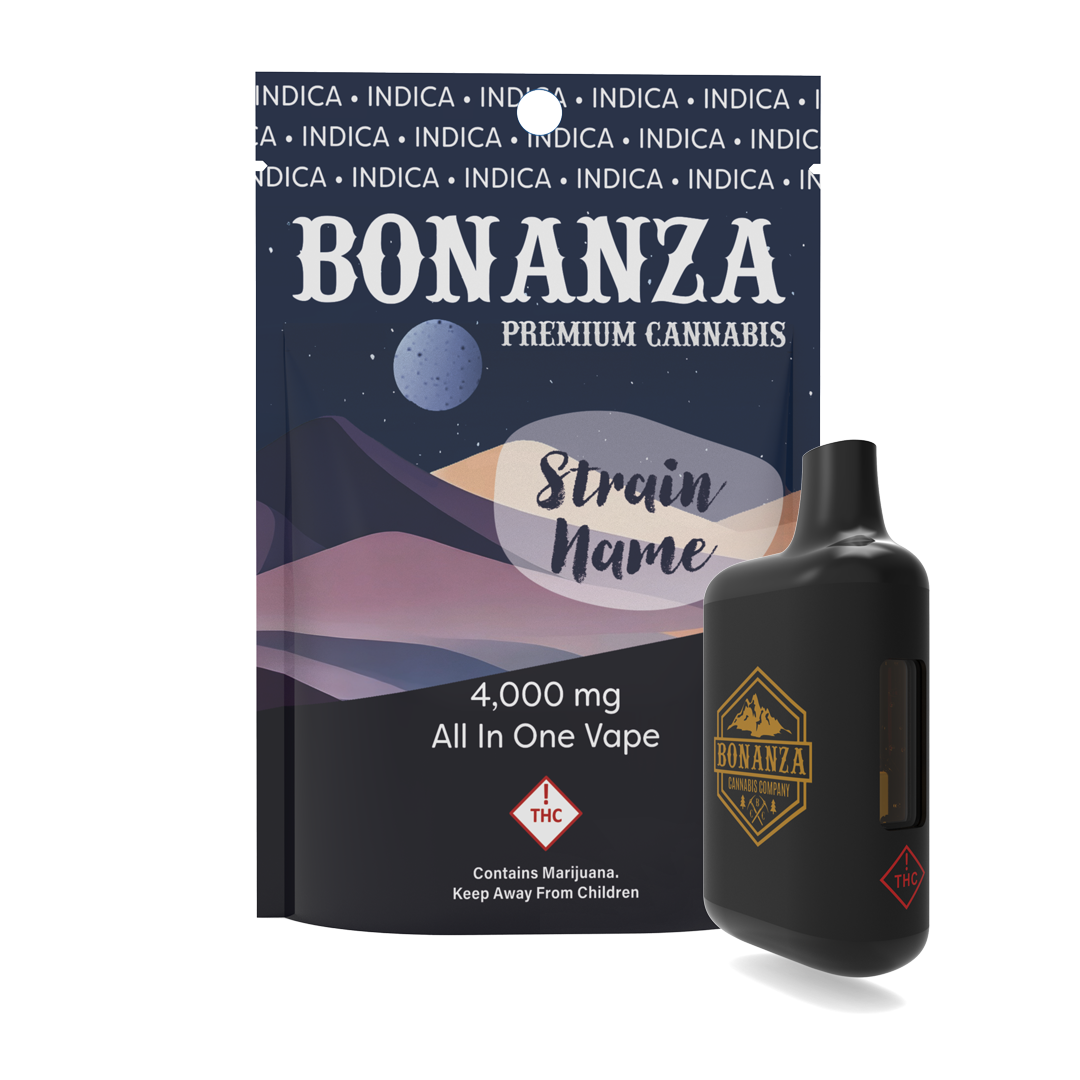 Bonanza All-In-One Vapes combine convenience and quality in a sleek, disposable design. Each device contains 4 grams of strain-specific cannabis extract, delivering smooth vapor, bold flavor, and consistent effects without the need for charging or refilling. Perfect for easy, on-the-go use, Bonanza AIO vapes are ready whenever you are. STRAIN TYPE: Indica-dominant.