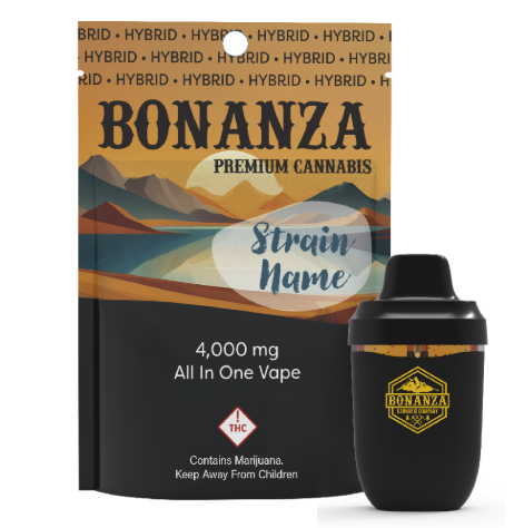 Bonanza All-In-One Vapes combine convenience and quality in a sleek, disposable design. Each device contains 4 grams of strain-specific cannabis extract, delivering smooth vapor, bold flavor, and consistent effects without the need for charging or refilling. Perfect for easy, on-the-go use, Bonanza AIO vapes are ready whenever you are. STRAIN TYPE: Balanced hybrid.