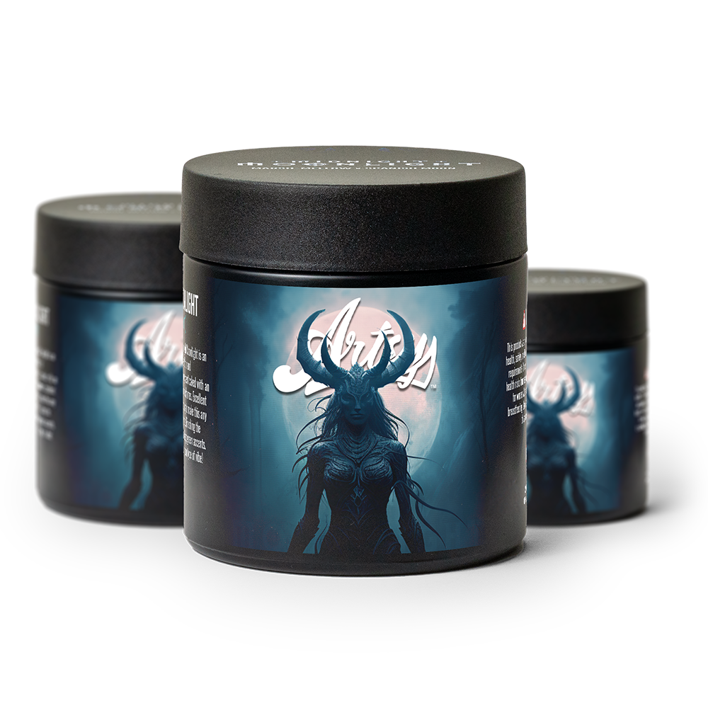 Artsy Craft Cannabis provides a uniquely memorable experience working with top-notch cultivators & artists to develop premium flower and one of a kind packaging. It is soil grown and hand manicured to ensure clean burn, great look, and amazing taste amazing. All of Artsy's plants are fed a nutrient line developed in-house and perfected by decades of experience. ABOUT THE STRAIN: The freaks come out at night! Midnight Moonlight is an out of this world cross of Spanish Moon and Marsh-Mellow. A fresh vanilla berry scent caked with an awesome amount of frost covered trichomes. Excellent nug structure with tight node spacing to make this any gardeners favorite flower to cultivate. Finishing the flower cycle with purple hues and deep green accents. Certainly, a perfect pick for a full moon type of vibe! STRAIN TYPE: Indica-dominant.