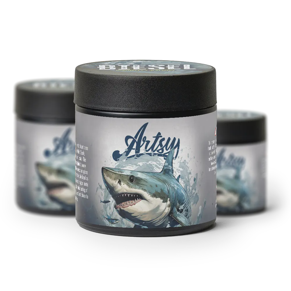 Artsy Craft Cannabis provides a uniquely memorable experience to its customers. Artsy works with top-notch cultivators & artists to develop premium flower and one of a kind packaging. Artsy cannabis is soil grown and hand manicured because we believe that quality product should burn clean, look great, and taste amazing. All of our plants are fed a nutrient line developed in-house and perfected by decades of experience. LINEAGE: Shark Haze x Sour Diesel ABOUT THE STRAIN: Sharks in the water! Biesel is a rare Sativa-dominant cross with a strong lineage that includes Great White Shark, Haze, Sour Diesel, and many other original classics. This bud has a skunky sour flavor with a sharp hint of savory diesel upon exhale. The aroma is of fresh herbs and spices with a heavy, pungent overtone that turns to dank diesel as the nugs are burned. Biesel buds have spade-shaped, minty green nugs with lots of dark orange hairs and a coating of thick frosty, clear crystal trichomes. An excellent choice to chill out and be inspired at the same time. STRAIN TYPE: Sativa-dominant.