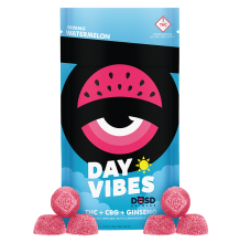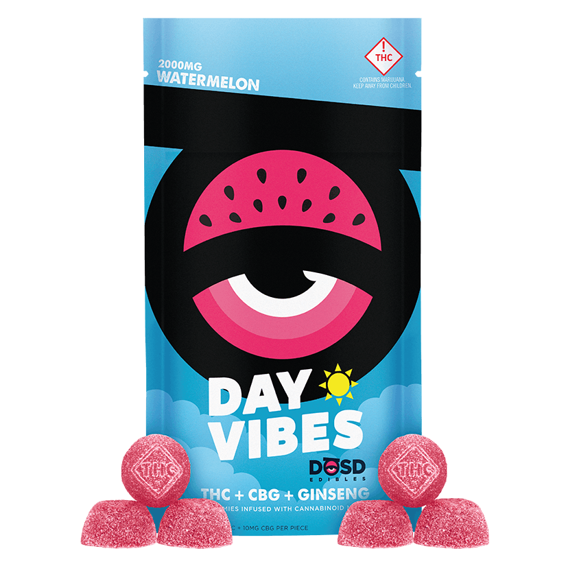 These bite-sized edibles are infused with cannabinoid nanoparticles for increased bioavailability, quicker onset, and extremely consistent experience with every gummy and batch. Day Vibes Nano Bites - Watermelon Flavored Gummies infused with Water-Soluble THC & CBG Cannabinoid Nanoparticles + Ginseng. What are THC Nanoparticles? Our DAY VIBES Nano Bites contain cannabinoid nanoparticles (made from ultra-refined cannabis extract), which are utilized by the body much more efficiently than unrefined oils. With increased bioavailability of THC & CBG, you can expect more out of your dose...with far less waiting. DOSD Nano Bites were created to mimic the consistency of traditional gummy brands found in grocery stores. Infused with water-soluble cannabinoid nanoparticles for quicker absorption and increased bioavailability. Average Onset: 20-25 minutes. Pieces per package: 20 x 100mg pieces (100mg THC + 10mg CBG + 25mg Ginseng per piece) INGREDIENTS: Glucose Syrup, Cane Sugar, Water, Gelatin, Sorbitol, Vegetable Glycerin, Tartaric Acid, Natural & Artificial Flavoring, THC Water-Soluble Distillate Blend, Natural & Artificial Coloring. DIETARY RESTRICTIONS: Gluten free.