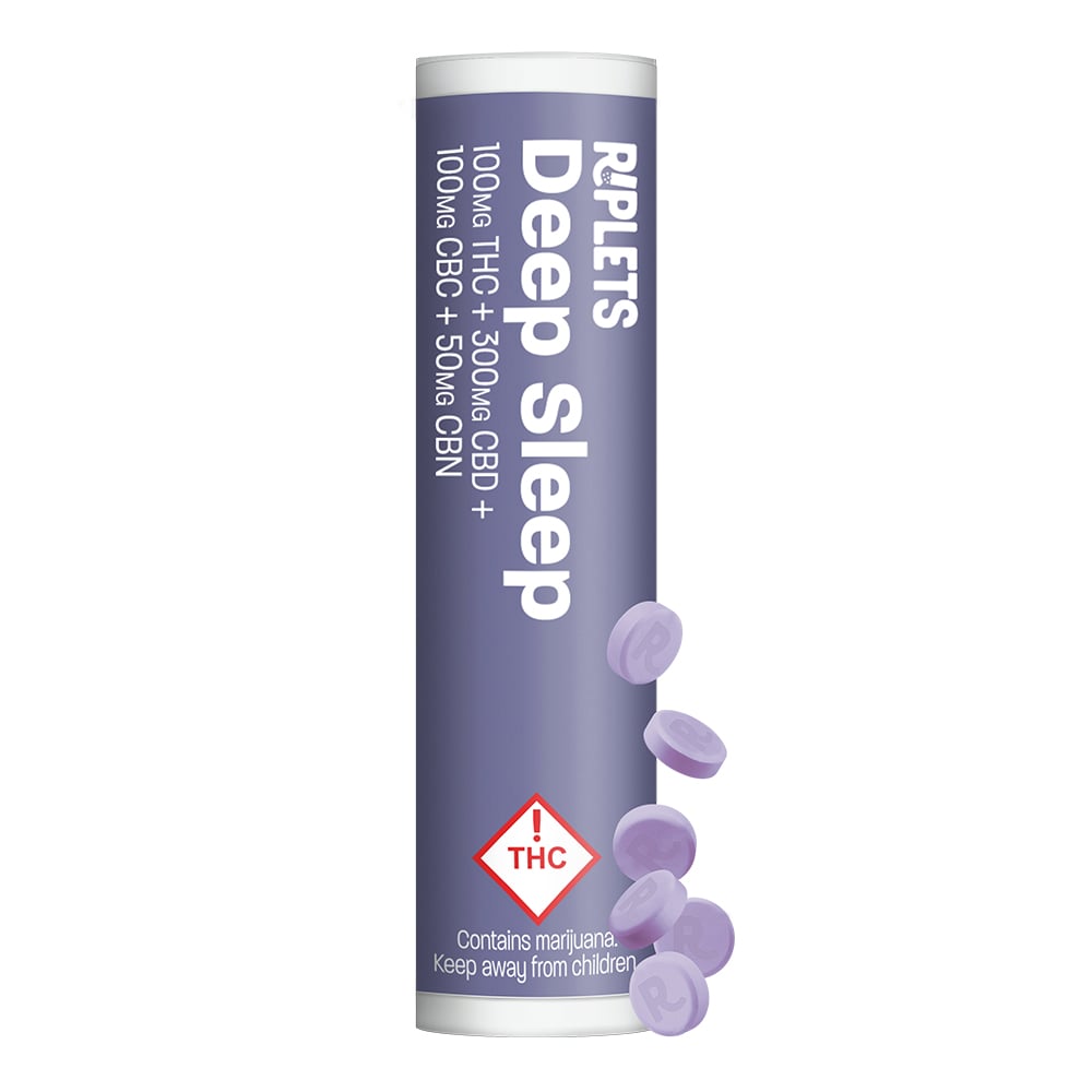 Deep Sleep Riplets + CBN, CBD, CBC Fall asleep fast — and stay asleep. No melatonin, no sugar, no starting at the ceiling. Deep Sleep Riplets contain a relaxing blend of THC, CBN, CBD, and CBC, to send you off to bed and see you there ‘til morning. With 20 pills per portable, recyclable tube, your dose is up to you. Just as with all Ripple products, Riplets are proven fast-acting and highly bioavailable. No need to pour or mix — simply swallow. Always discreet, convenient, and consistent. DIETARY: Zero sugar, Zero calories, Gluten-free, Vegan. STRAIN TYPE: Indica-Like effects. THC: 100mg CBN: 50mg CBD: 300mg CBC: 100 mg 5mg THC : 2.5mg CBN : 15mg CBD : 5mg CBC per pill x 20 pills per container