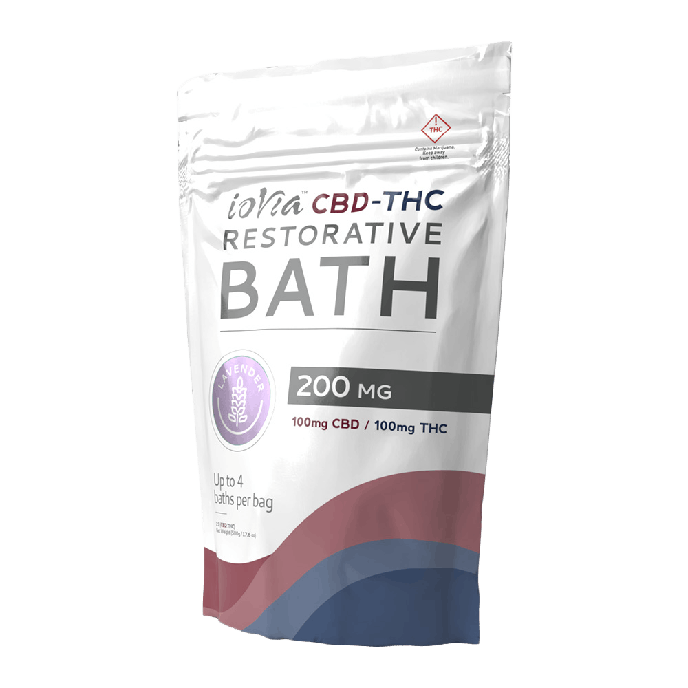 IoVia™ CBD-THC Restorative Bath is rich in magnesium and other minerals that ease stress and inflammation, paired with carefully-selected scents to enhance the medicated experience. Available in skin-nourishing aloe vera, soothing lavender, or rejuvenating tea tree, this balanced blend of CBD and THC is ideal for soaking away tension, muscle soreness, and stressful days. Includes enough product for up to 4 uses. Restorative Bath is there when you get home to ease pain and stress along with revitalizing your body and mind with CBD, THC, and essential oils. DOSAGE: 100 mg CBD / 100 mg THC per bag. 17.6 oz Foil Bag / 500g total net weight.
