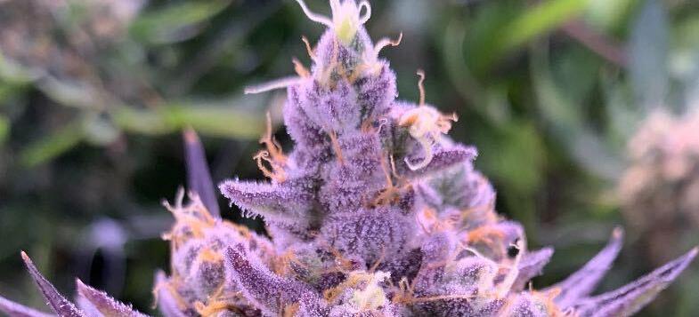 The plant is of average height with a variety of colors, often with purple hues. The flowers are spongy and covered in crystal trichomes. The buds are dark green and dense.